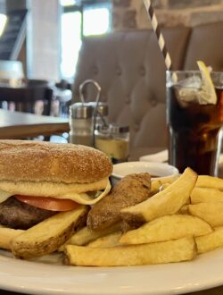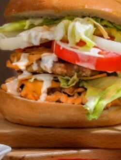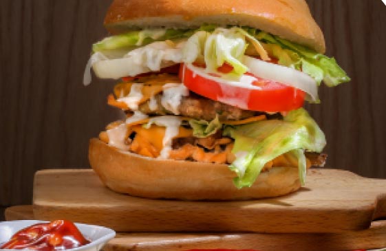 Nous proposons des Burger à base de viande hachée, mais aussi de poulet. En accompagnement, vous avez le choix entre les crudités, frites et sauces variées.